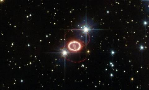 Supernova 1987A je bila eden izmed prvih objektov, ki jih je na začetku devetdesetih let opazoval Hubblov vesoljski teleskop. Ta in kasnejši posnetki so okrog supernove razkrili hitro razširjajoč se obroč snovi, ki je zvezdo zapustil dvajset tisoč let pred eksplozijo. Po letu 2000 ga je dosegel in razsvetlil udarni val supernove. Še posebej zanimiva so številna vroča področja, zaradi katerih obroč spominja na biserno ogrlico. Avtorstvo slike: NASA, ESA in R. Kirshner (Harvard-Smithsonian Center for Astrophysics in Gordon and Betty Moore Foundation) in P. Challis (Harvard-Smithsonian Center for Astrophysics).